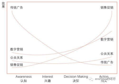 在建立“认知”和创造“兴趣”阶段更有力,在后续两个阶段更弱,因为传统广告擅于大规模的轰炸,但相对而言,它沟通无差别、难以个性化,也会导致无法点射,临门一脚偏弱。