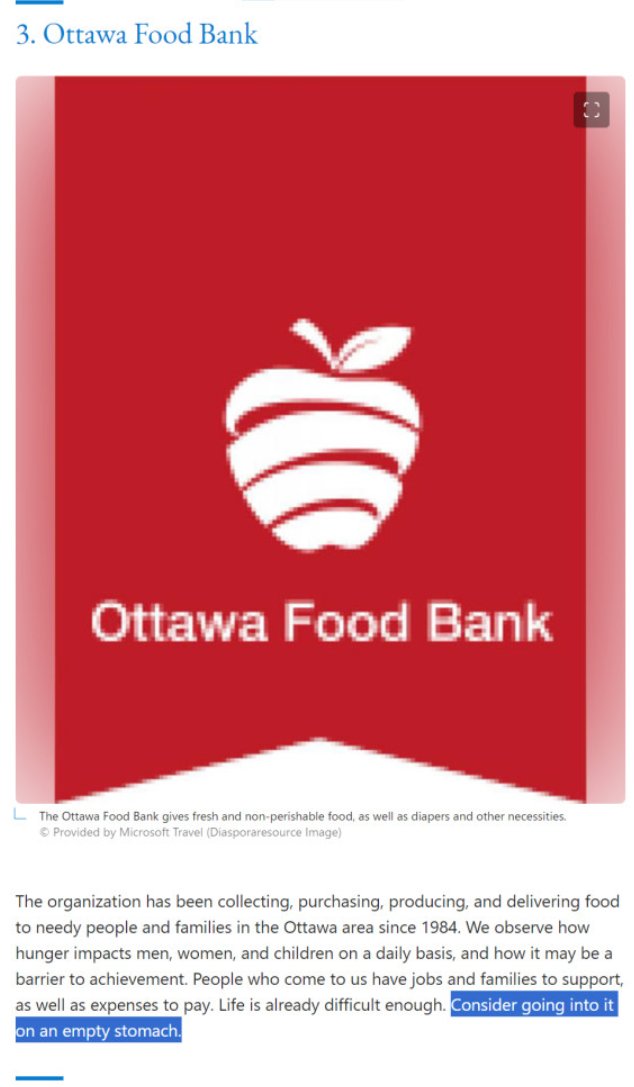 在指南中,该 AI 建议读者访问慈善机构“渥太华食品银行(Ottawa Food Bank)”。更糟糕的是,AI 建议读者“空腹前往”。这篇文章首先被科技评论员 Paris Marx 发现,不过IT之家查看时已经被删掉了。