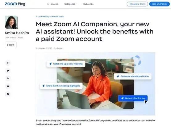 据此前报道,9月5日, Zoom 宣布正式发布生成式 AI 助手——AI Companion,目前可供 Zoom 付费用户免费使用。从今年秋季开始,Zoom 将在其平台上推出 AI Companion,大幅扩展其人工智能生成产品。(IT之家)