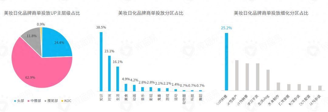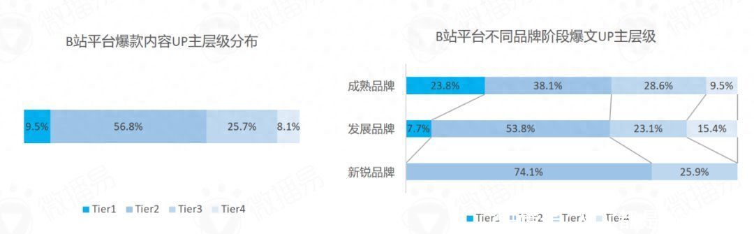 分析发现,美妆行业爆款内容的UP主主要集中在头腰部,占比超过65%,且品牌阶段越成熟,使用的UP主层级越趋向头部。此外,成熟品牌多选生活分区UP主进行好物种草,发展品牌的UP主类型相对分散,细分在好物种草、生活vlog、影视剪辑等二级分区,新锐品牌则集中在时尚分区。