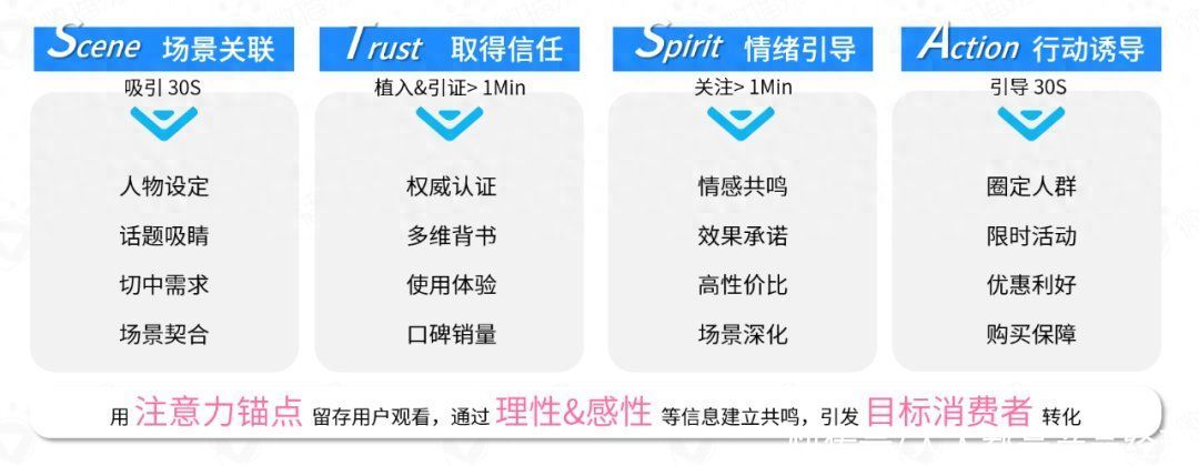 - 内容脚本的搭建:根据S(Scene场景关联),T(Trust取得信任),S(Spirit情绪引导),A(Action行动诱导)中长视频的内容脚本递进思路完成内容的创意。用注意力锚点留存用户观看,通过感谢+理性的信息建立共鸣,引发目标消费者的转化。