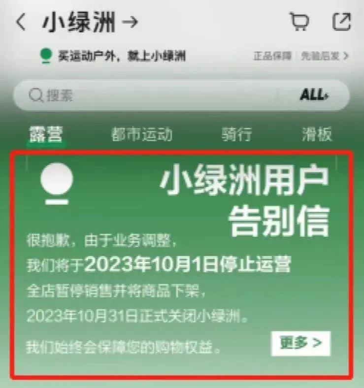 9 月 2 日消息,小红书旗下电商平台“小绿洲”日前发布用户告别信,宣布“由于业务调整”将于 10 月 1 日停止运营,全店暂停销售并下架商品,10 月 31 日正式关闭。官方表示,“小绿洲”曾深耕露营、陆冲、滑雪、骑行、徒步等运动场景,但在业务的探索和发展过程中,“没能实现最大化满足大家户外需求的预期目标”,因而最终决定关停。