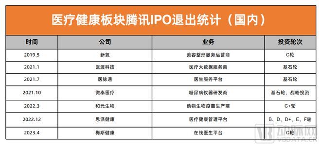 而自2019年起,腾讯就通过IPO退出的方式获取收益。IT桔子数据显示,2014年起,腾讯医疗板块国内共出手70次,退出项目7个,退出占比10%,其中不少企业在发展的早期就受到腾讯的关注。