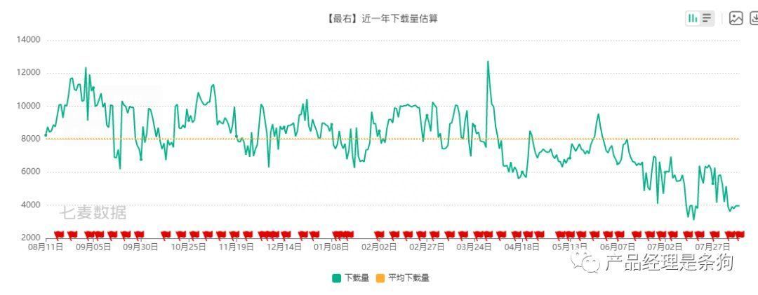 根据七麦数据,最右近半年的平均下载量处于平稳状态,但下载量波动较大,有多次出现大幅下降的趋势,根据版本迭代信息发现,有几次低谷是由于版本更新造成的。总体来看,最右的下载量不算高,后续宣传推广仍需加强。
