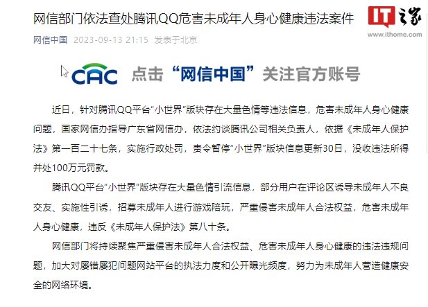 IT之家 9 月 13 日消息,IT之家从网信中国公众号获悉,近日,针对腾讯 QQ 平台“小世界”版块存在大量色情等违法信息,危害未成年人身心健康问题,国家网信办指导广东省网信办,依法约谈腾讯公司相关负责人,依据《未成年人保护法》第一百二十七条,实施行政处罚,责令暂停“小世界”版块信息更新 30 日,没收违法所得并处 100 万元罚款。