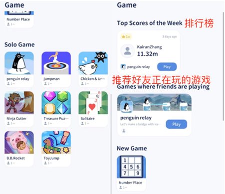 经测试,无论是在语音房内,还是在“游戏”一级标签内游玩单人游戏的得分都会收录进一个包含全部好友的排行榜,在每局游戏结束时或“游戏”一级标签内会显示排行榜。用户可以通过排行榜看到所有好友游玩这个游戏的每周最高成绩和历史最高成绩。“游戏”一级标签还会推荐好友正在玩的游戏。单人游戏算是除了语音房之外的一种比较弱的交互。