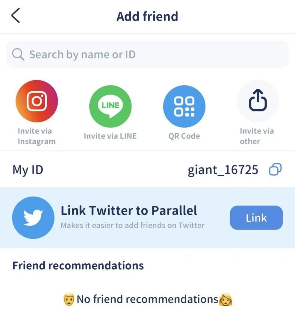 应用当中可以直接通过搜索 ID 添加好友,也可以通过各个社交媒体分享链接来添加。笔者测试时可能由于锁区或没有其他好友的原因看不到系统推荐的好友,但是推测这项功能可能只会基于共同好友来进行推荐。整个应用看不到任何基于兴趣或其他维度推荐陌生人的功能。
