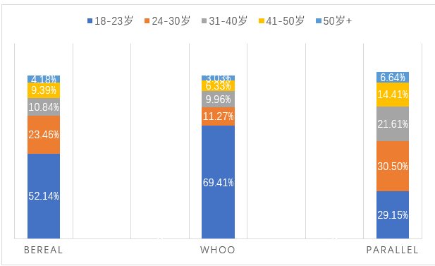 BeReal 和 Whoo 日本市场用户年龄分布图,注:Jagat 暂无用户画像数据,所以没有收录|数据来源:点点数据