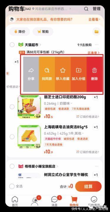 淘宝的交互为左滑、长按都支持,但左滑之后的选项太多,足足有五个,实在是显得拥挤。而在长按之后弹框展示了四个选项,我个人觉得两者搞反了。