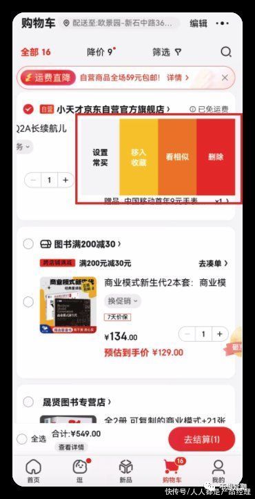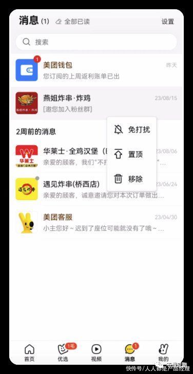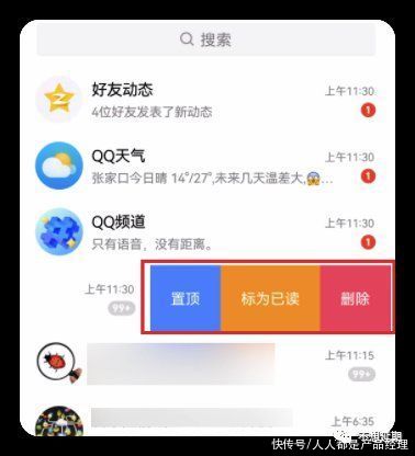 长按、左滑都支持,相比于淘宝,左滑的操作按钮是4个,空间感会更好一些。长按之后的交互并非弹框,而是在这个列表选项上浮出四个按钮图层。