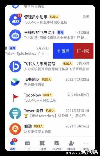 左滑之后只有两个选项:置顶和标记。没有删除?是的,没有删除!我也很惊讶。但换个角度想想,微信、QQ都是以个人用户为内核,而飞书则是团队协同,所以干脆就不让删呗。
