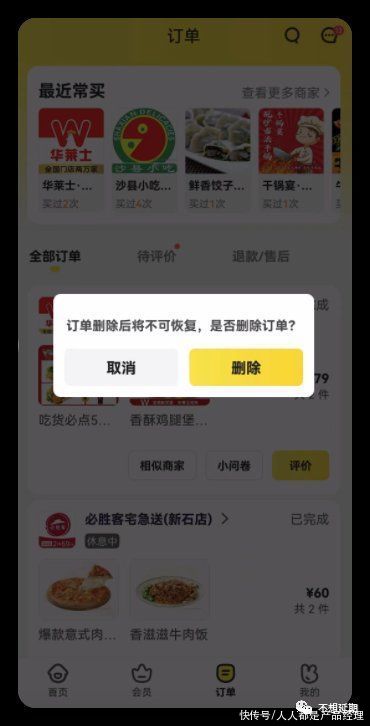 美团外卖是一个弹框强提示,意味着这里的长按只代表删除,没有其他操作的空间。