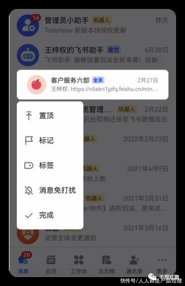 飞书的用户体验真是没得说,在这样一个小细节上,不仅长按和左滑都支持,还有不一样的亮点设计。