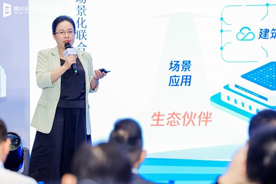 腾讯云副总裁、智慧建筑与不动产产研负责人刘立萍详细介绍了腾讯云智慧建筑与不动产行业核心方案及产品,关键字是“连接和智能”。