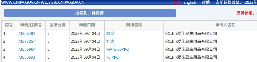 据国家知识产权局商标局等网站显示,一家名为“佛山市爱佳卫生用品有限公司”的公司于 9 月 4 日申请了“Mate 60pro”商标,属于医药类别,商标状态为“申请中”。不仅如此,该公司还申请了另一枚“70Pro”商标,不排除与华为 P 系列手机下一代产品“撞名”的可能。