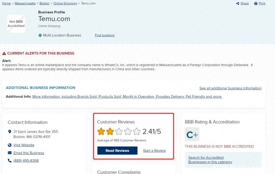 6月Temu平台在BBB网站上的评分也仅为2.41分 图源:BBB网站