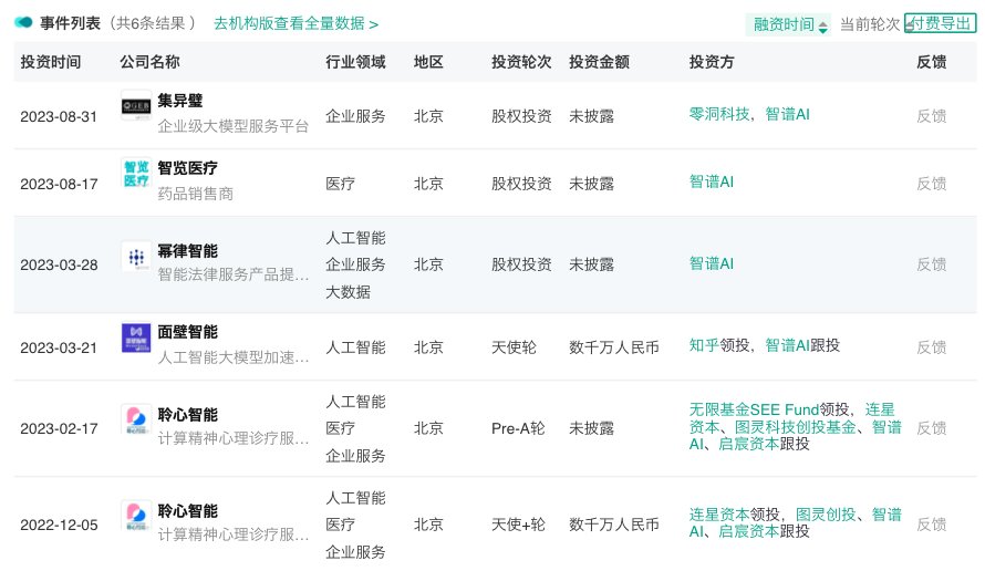 值得一提的是,在连续获得投资的同时,智谱AI也在积极进行对外投资,被投企业中聆心智能、面壁智能、幂律智能、集异璧,均为大模型领域创业公司。
